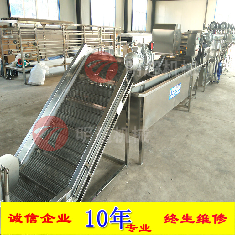 6.漂燙冷卻線:根莖類切制的是土豆、紅薯、蓮藕、茄子、黃瓜、蔬菜、山野菜等等,比如土豆切成絲后,里面的纖維收到破壞,跟空氣結合可使土豆絲變黑,有類似情況的蔬菜,都需要進行漂燙冷卻生產線,針對蔬菜如果沒有這種情況的這道工序可以不用,具體還要看情況而定,漂燙冷卻生產線主要是采用水浴式,水可達到0-100攝氏度以內,對果蔬進行漂燙、殺青、蒸煮或者包裝袋的殺菌等等,是一種多功能巴氏殺菌冷卻線的設備,水槽內部設有循環水泵,水的溫度均勻,果蔬進行漂燙的過程中受熱均勻,網帶伸縮性強,在這里介紹一下網帶,網帶的密度是根據要物料的大小來單獨定制的,這個就跟廠家有關系了,在這里就簡單的讓用戶知道有這方面知識,簡單了解一下就可以,漂燙后的果蔬需要進行冷卻,冷卻機的冷卻方式采用常溫水或強制冰水,還有為了讓蔬菜的保鮮程度高一些,可以采用磁化水,這個在咨詢前一定要跟我們明超機械銷售人員說清楚